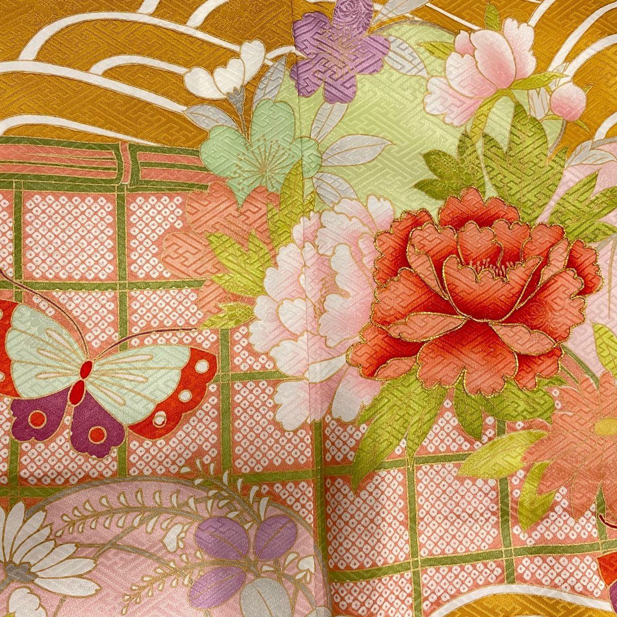 振袖 身丈158cm 裄丈64.5cm M 袷 花丸文 蝶 金糸 金彩 山吹色 正絹 秀品の検索結果