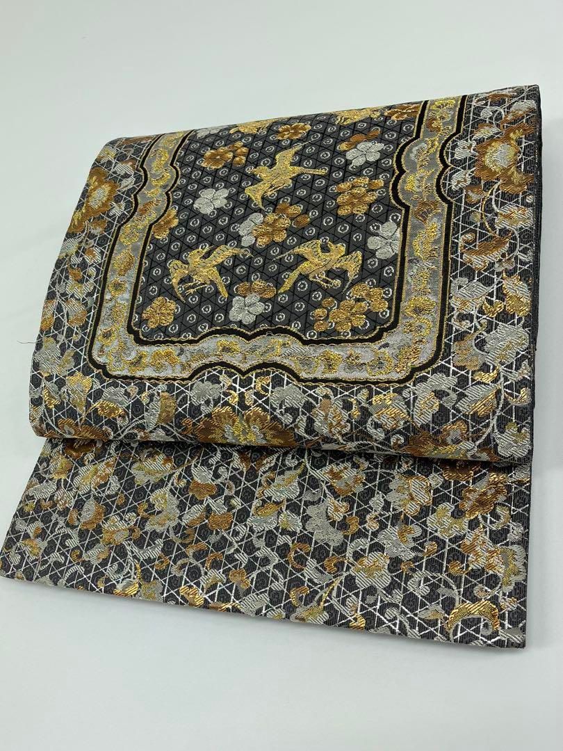 加納幸 西陣織 袋帯 篭魚子裂 鳥 金糸 正絹 三通 GLOBALQUALITYIMPORTS_COM