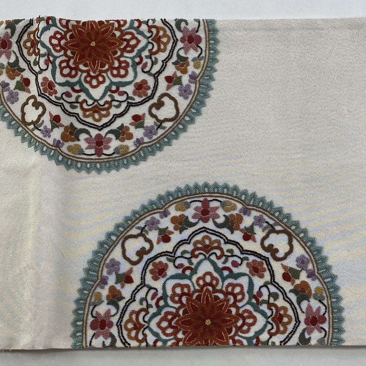 袋帯 華文 草花 相良刺繍 金糸 灰白 お太鼓柄 正絹 GLOBALQUALITYIMPORTS_COM