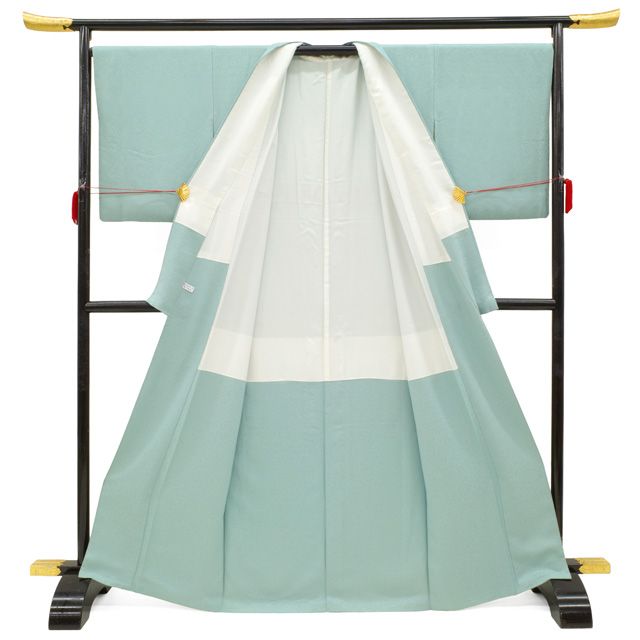 色無地 着物 リサイクル 正絹 ますいわ屋 扱い 青磁色地 ミント 青緑 地紋 寄せ柄 蜀江 華文 草花 花鳥 牡丹唐草 一つ紋 桔梗 セミフォーマル 春 秋 冬 仕立て上がり 身丈165 裄丈69 Lサイズ みやがわ sb16466の検索結果