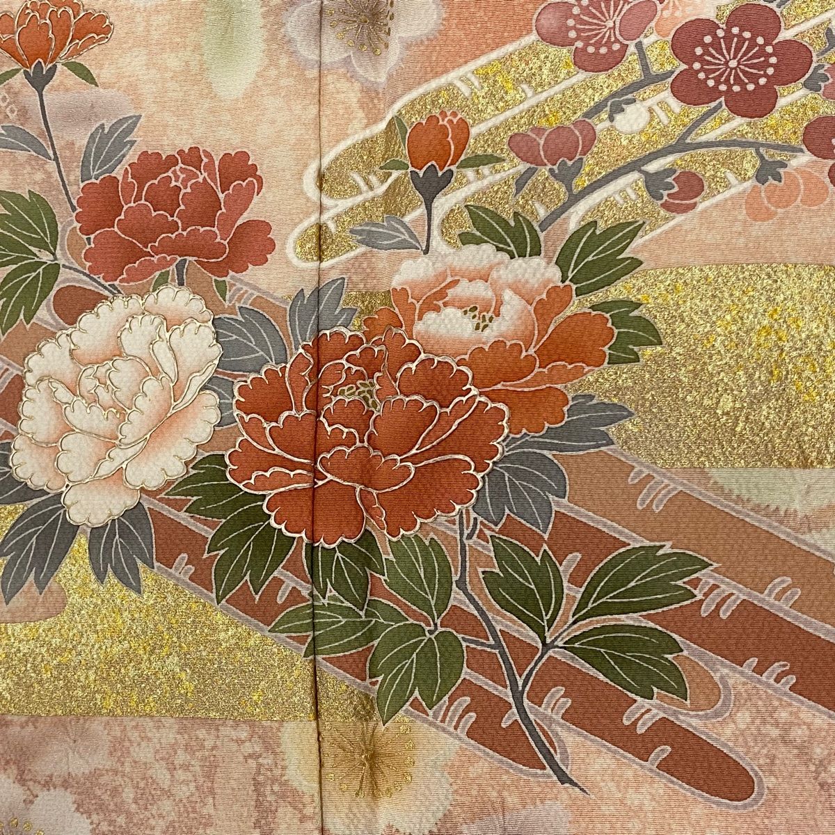 訪問着 身丈165cm 裄丈66cm M 袷 竹 草花 金銀彩 ぼかし ピンクベージュ 正絹 秀品