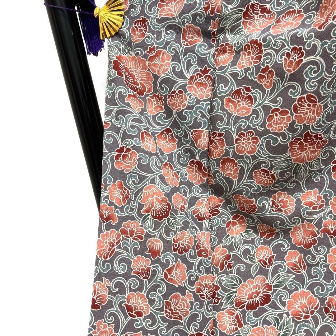 くすみのパープルの地に唐草と牡丹や唐花の文様が描かれたお洒落なデザインの一着です。