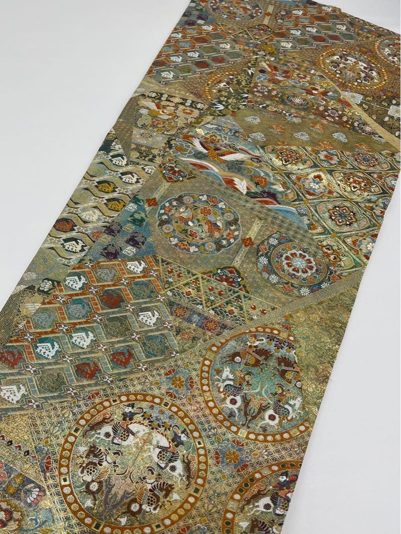 西陣あさぎ 壱阡八百口織 全通 丸帯 狩猟文 鳳凰 動物 正倉院名物裂集成 正絹 GLOBALQUALITYIMPORTS_COM