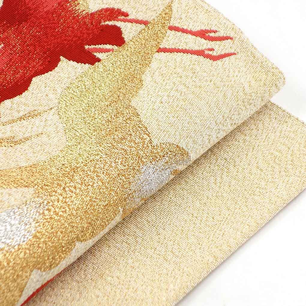 名古屋帯 幅30.5cm 長さ340cm レディース 鶴 秋冬春用 正絹 シルク ゴールド やや難 安田織楽 リメイク リユース リサイクル 呉服のきくや GLOBALQUALITYIMPORTS_COM