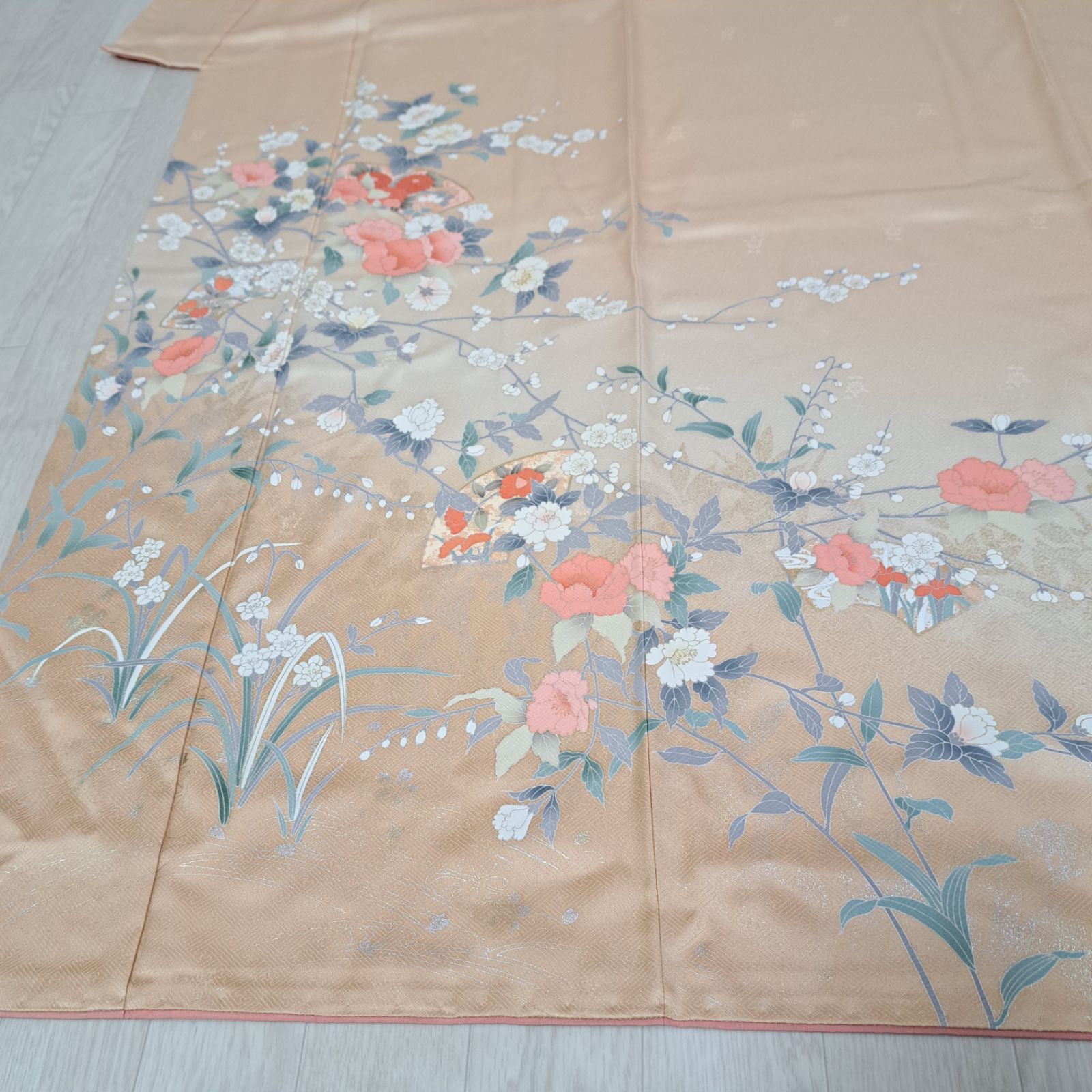 訪問着 裄69 身丈167.5 袖48.5 作家物 正絹 袷 うすだいだい地に四季花柄 め17S07 k2517の検索結果