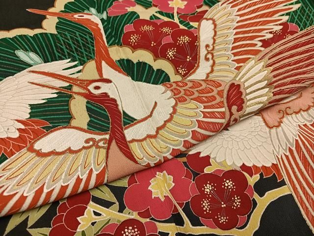 平和屋着物 アンティーク 大正ロマン 振袖 松竹梅群れ鶴文 黒地 金彩 正絹 AABC6839phの検索結果