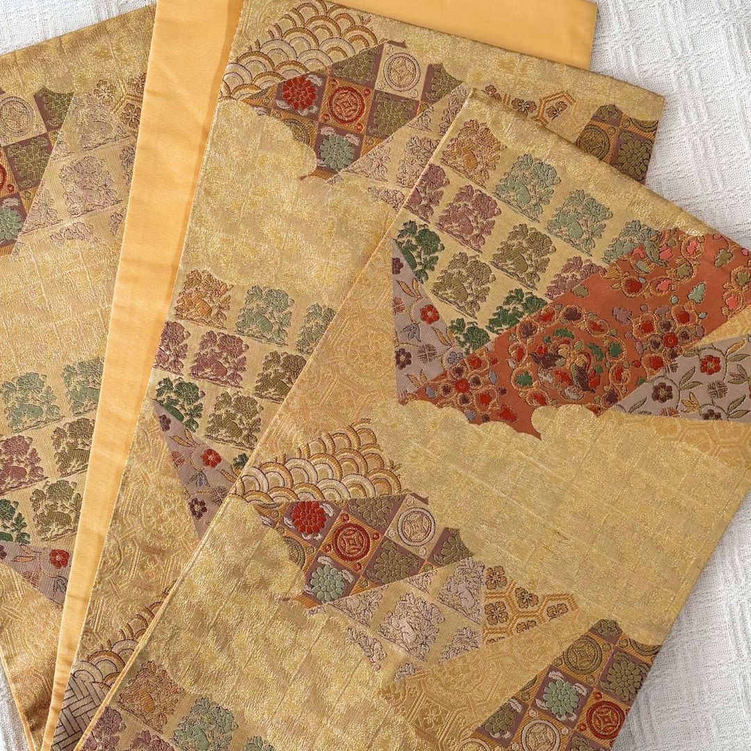 金彩と蝶の模様が優雅に舞い、見る角度によって表情が変わる華やかなデザイン。