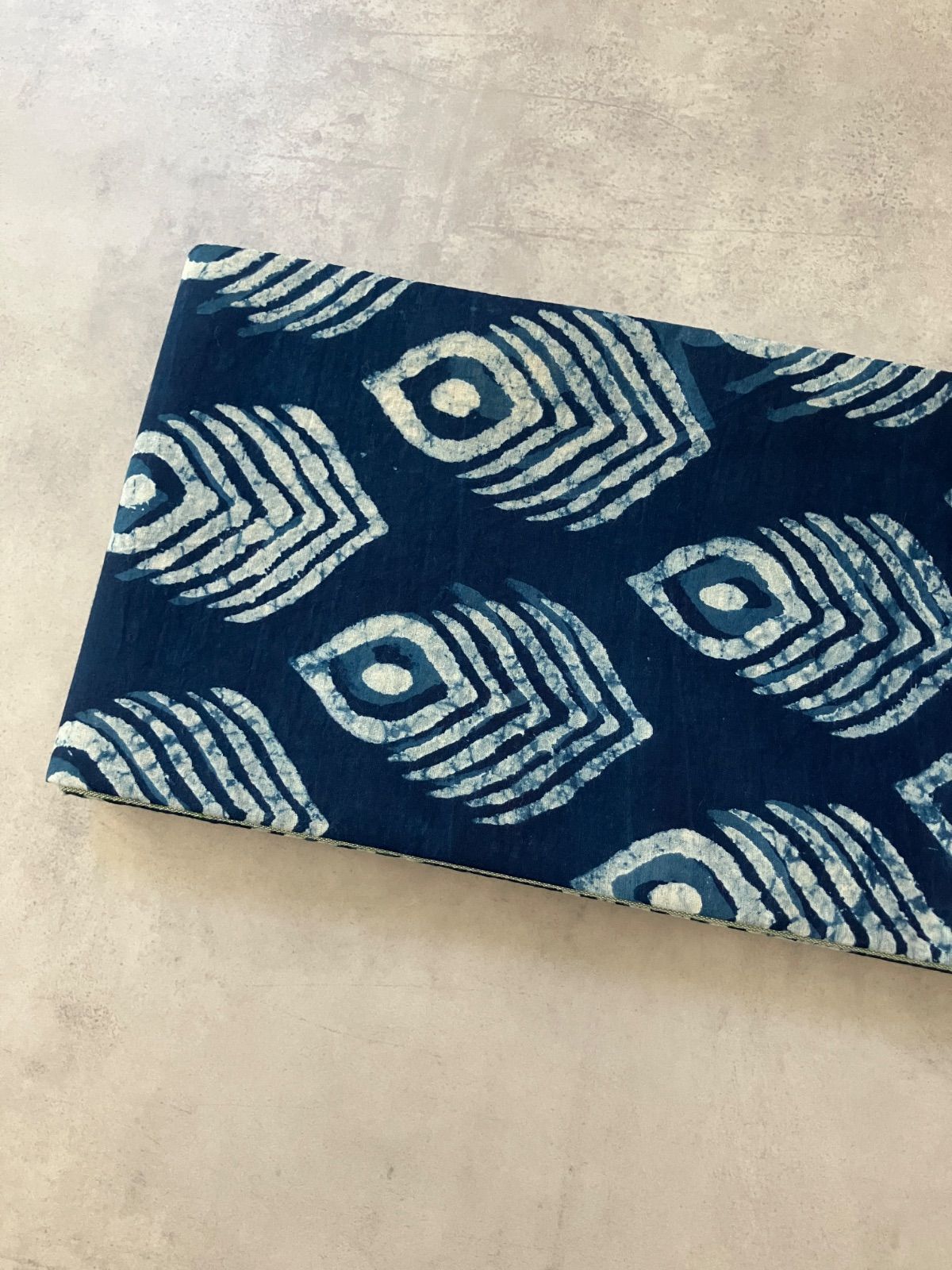 藍染のような深い青地に、目のようにも羽根のようにも見える幾何模様がリズムよく並ぶ、インドのブロックプリント生地を表地に用いたリバーシブル半幅帯。