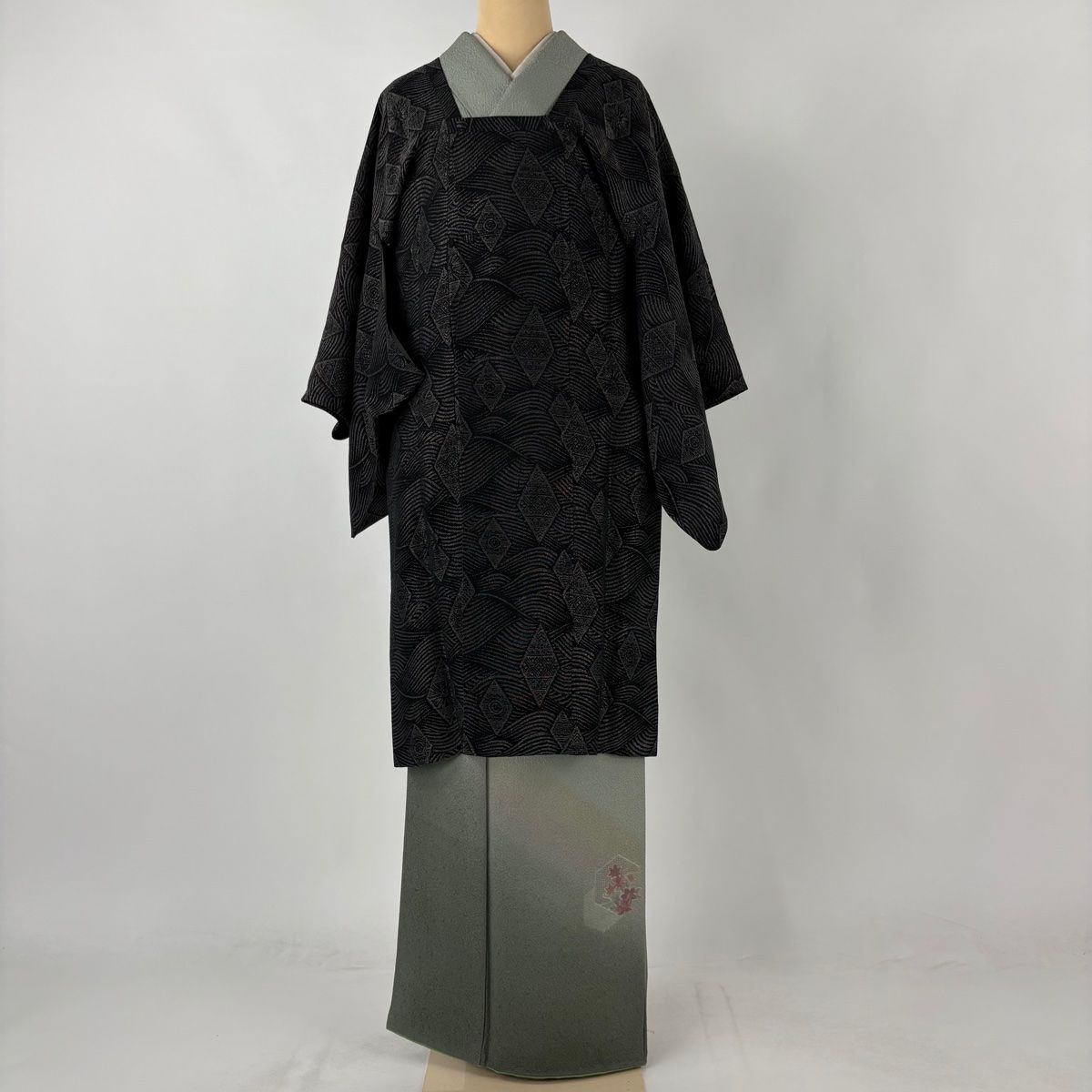 道行 身丈104.5cm 裄丈62cm S 和装コート 角衿 波 菱 箔 黒灰 正絹の検索結果