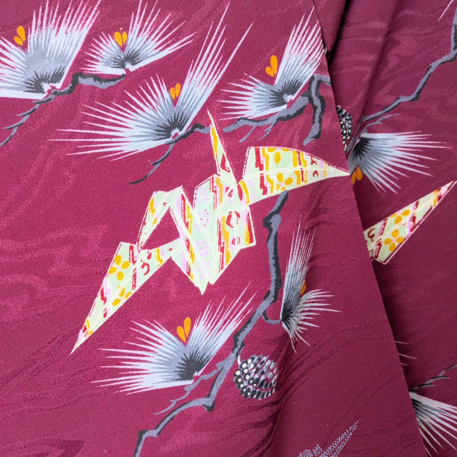 Japanese Vintage Haori Long Bordeaux Origami pattern Silk Kimono Jacket Old-ⅽloth 長羽織 羽織 正絹 躑躅色 ボルドー 折り鶴柄 古布 時代布 大正浪漫 和洋折衷 GLOBALQUALITYIMPORTS_COM