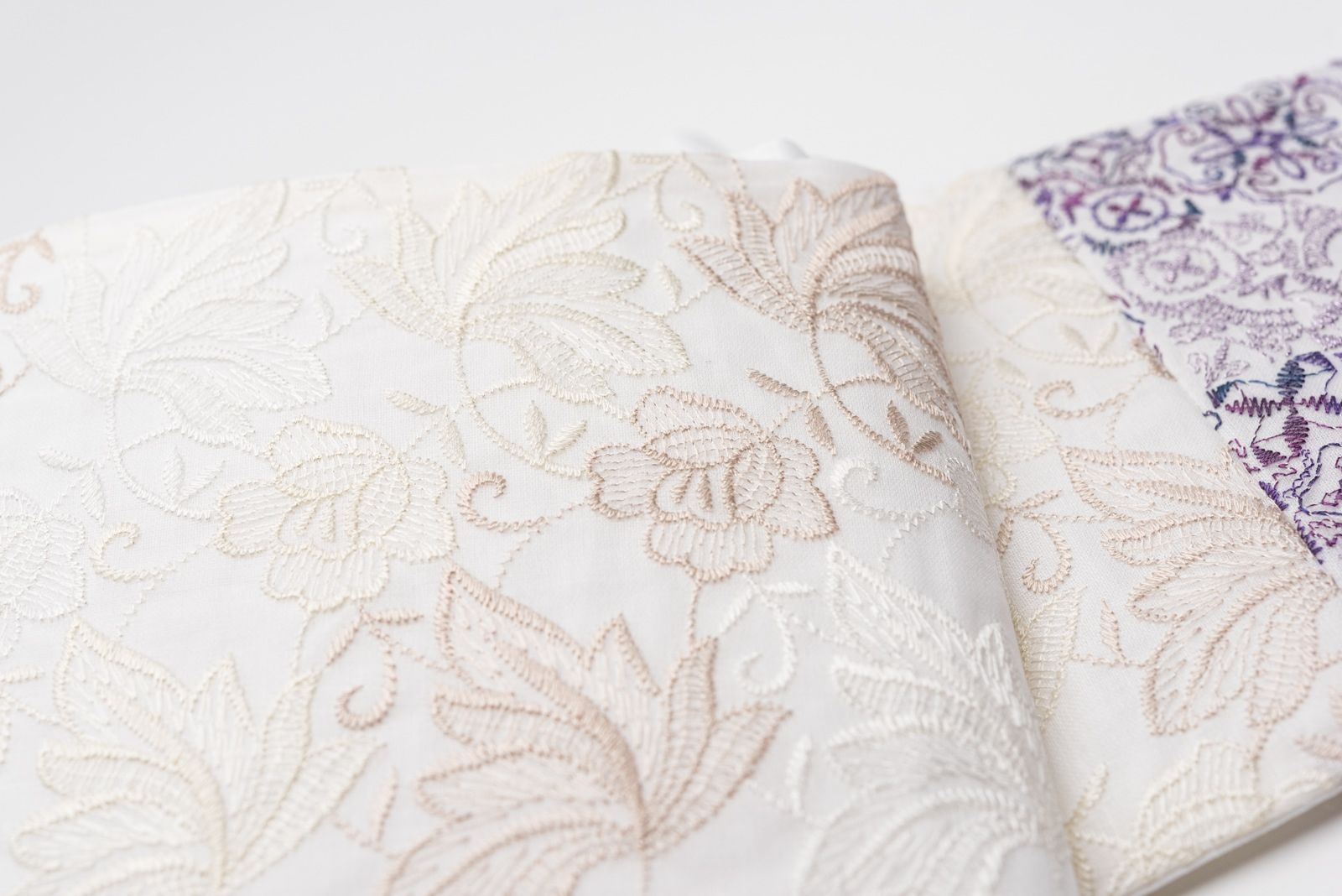 薔薇、葉、菊、唐花など様々な模様のレースが1本で楽しめる大変贅沢な帯です。