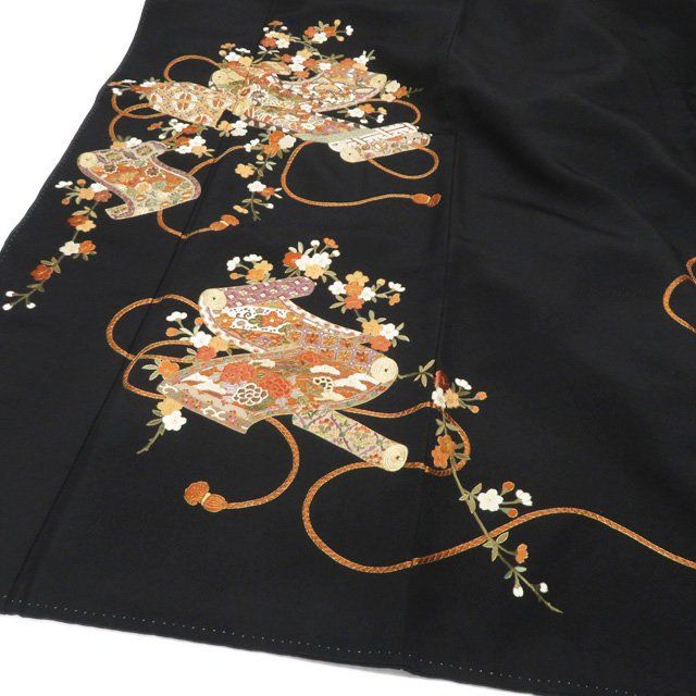 黒留袖 着物 正絹 袷 五つ紋 蘇州刺繍 巻物に花の図 金糸 黒色 多色 身丈158cm 裄64.5cm M きもの北條 A1274-8 GLOBALQUALITYIMPORTS_COM