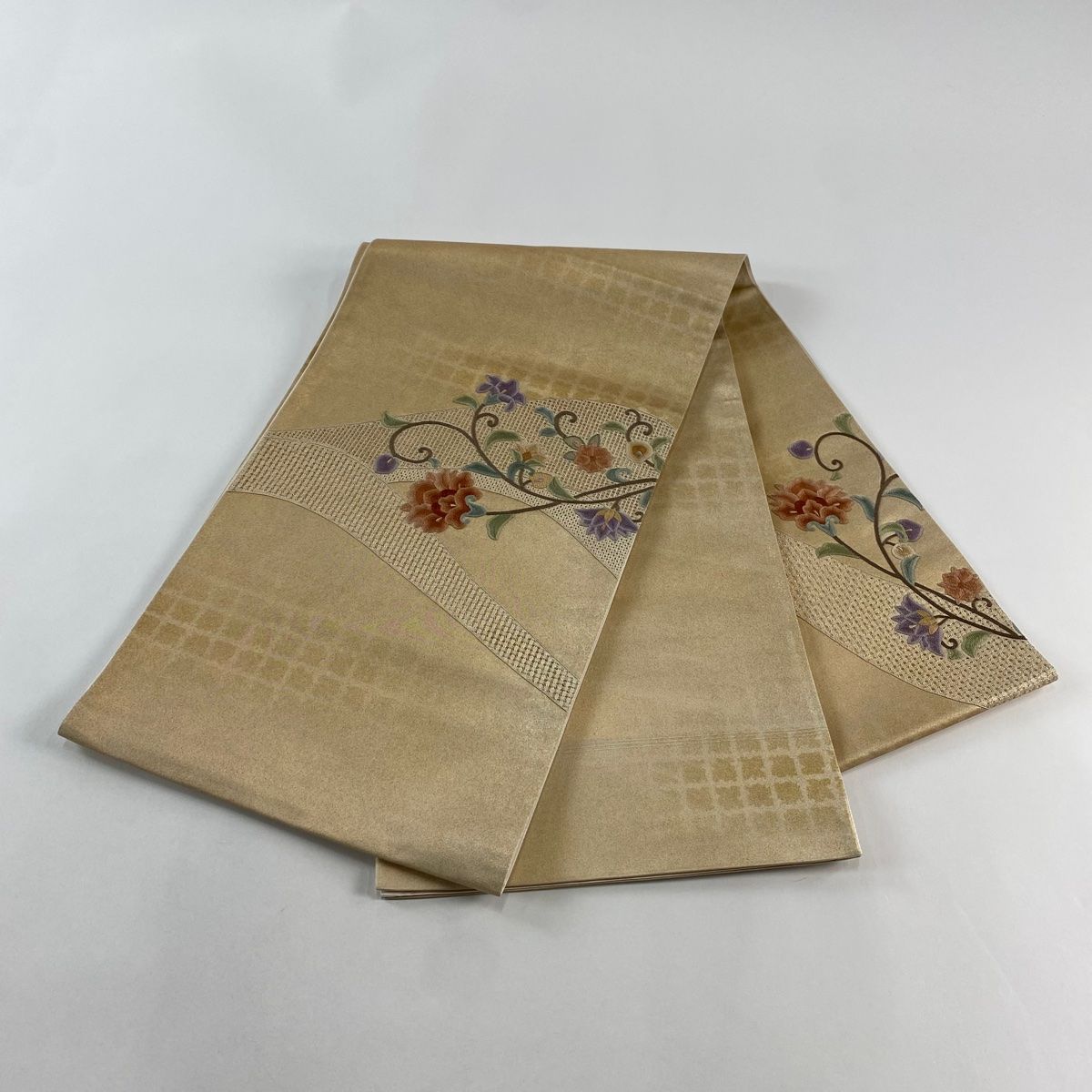 袋帯 秀品 枝花 刺繍 金彩 ベージュ お太鼓柄 正絹 GLOBALQUALITYIMPORTS_COM