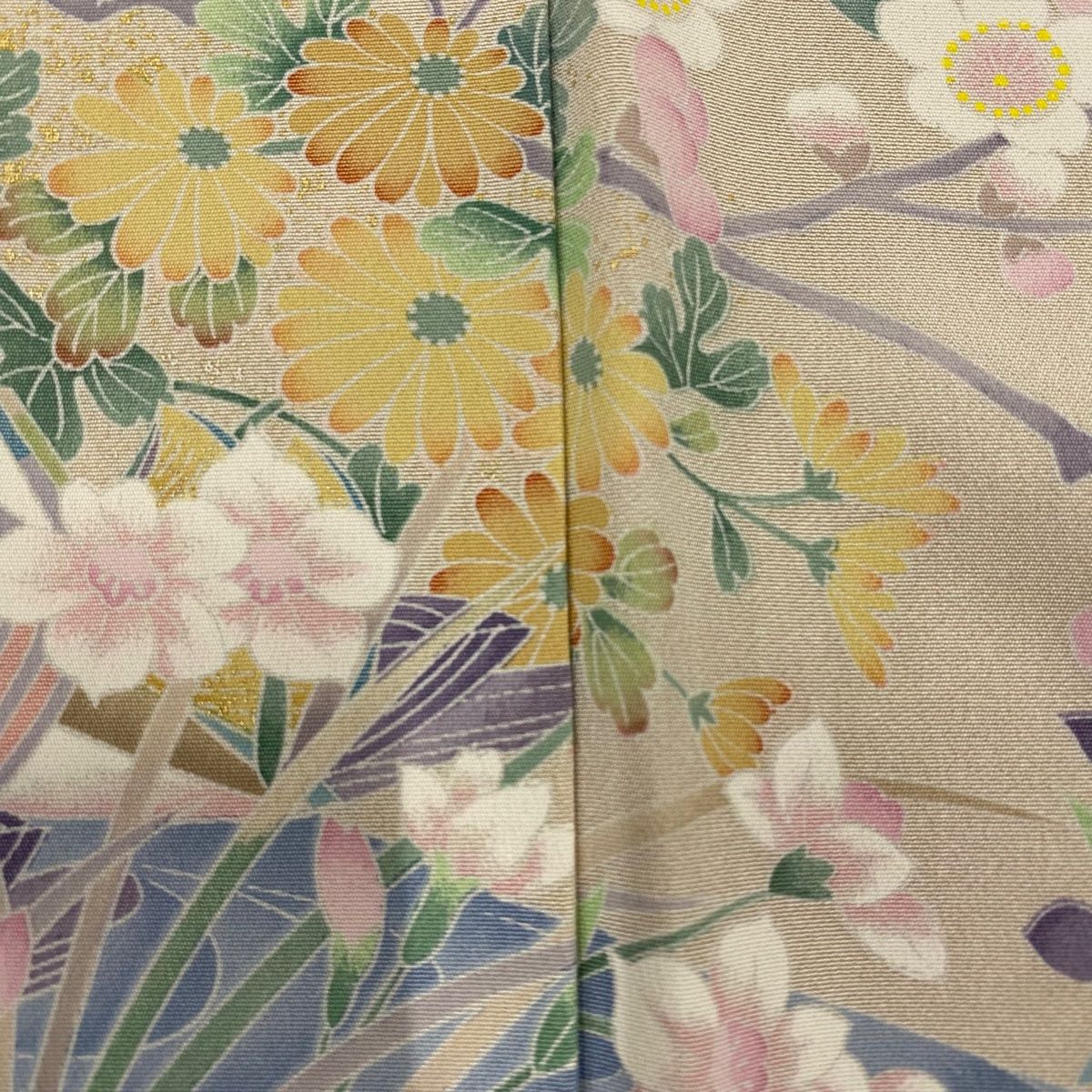 訪問着 身丈158.5cm 裄丈65cm M 袷 背抜き 短冊 草花 金糸 金彩 灰紫 正絹 秀品