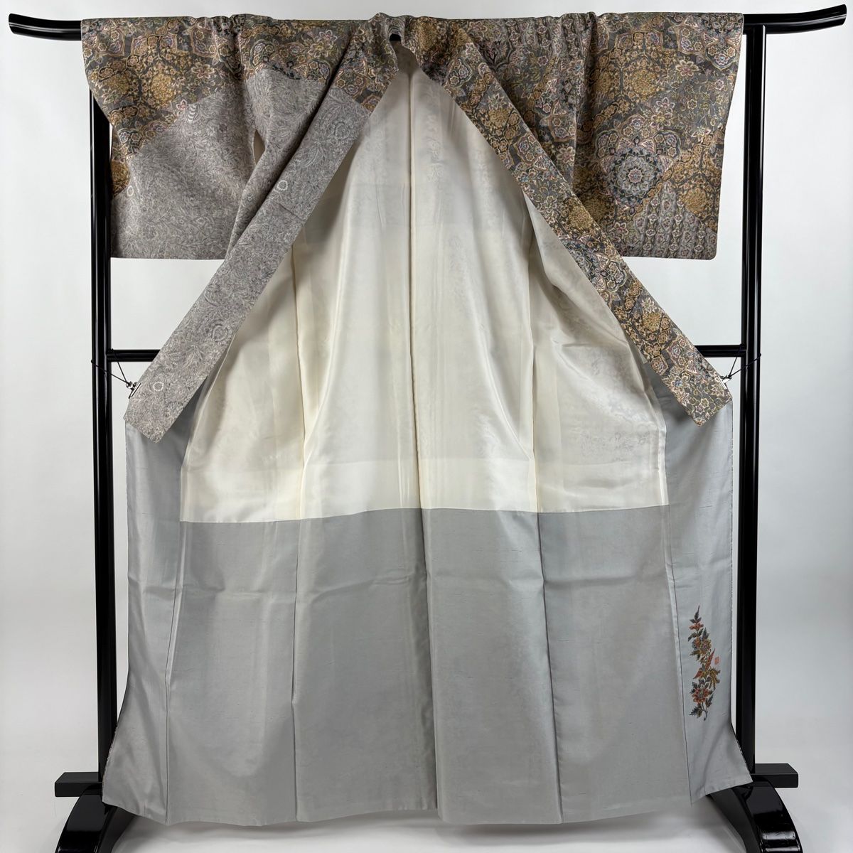 付下げ 身丈169cm 裄丈66.5cm M 袷 洗える着物 草花 七宝 金糸 刺繍 灰緑 化繊 秀品
