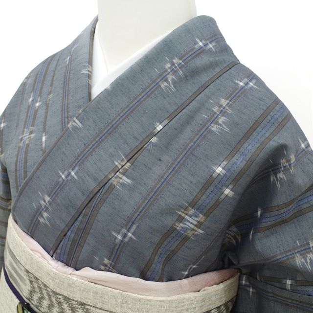 本場琉球かすり 紬 着物 リサイクル 正絹 袷 沖縄県 手織り 琉球絣 ブルーグレー 縞 ツバメ 十字絣 水流 カジュアル 琉球かすり 紬 着物 春 秋 冬 仕立て上がり 身丈161 裄丈68 Mサイズ みやがわ sb16367 GLOBALQUALITYIMPORTS_COM