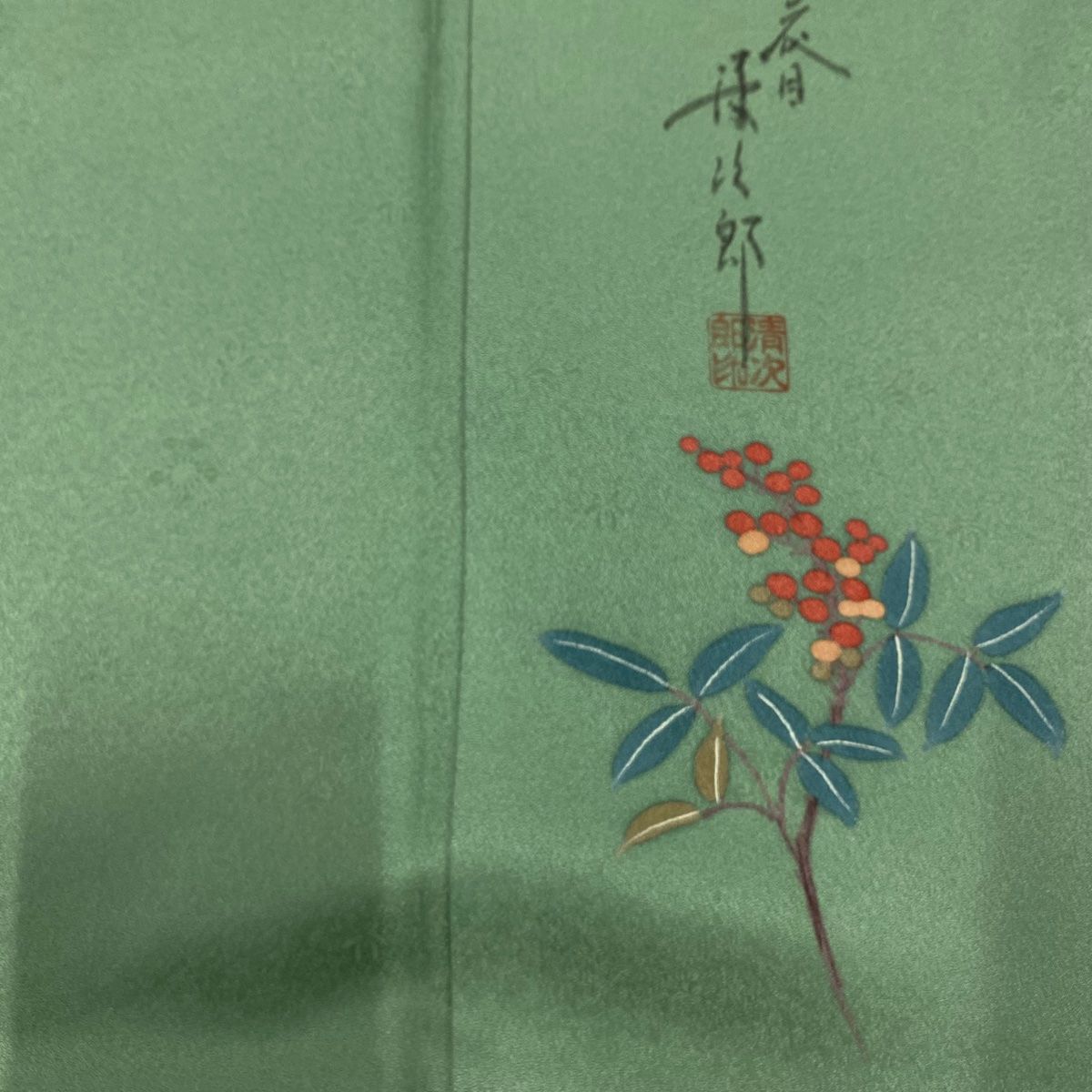 色無地 身丈157cm 裄丈64cm M 袷 二代目清次郎 落款 地紋 薄緑 正絹 秀品 一つ紋 GLOBALQUALITYIMPORTS_COM
