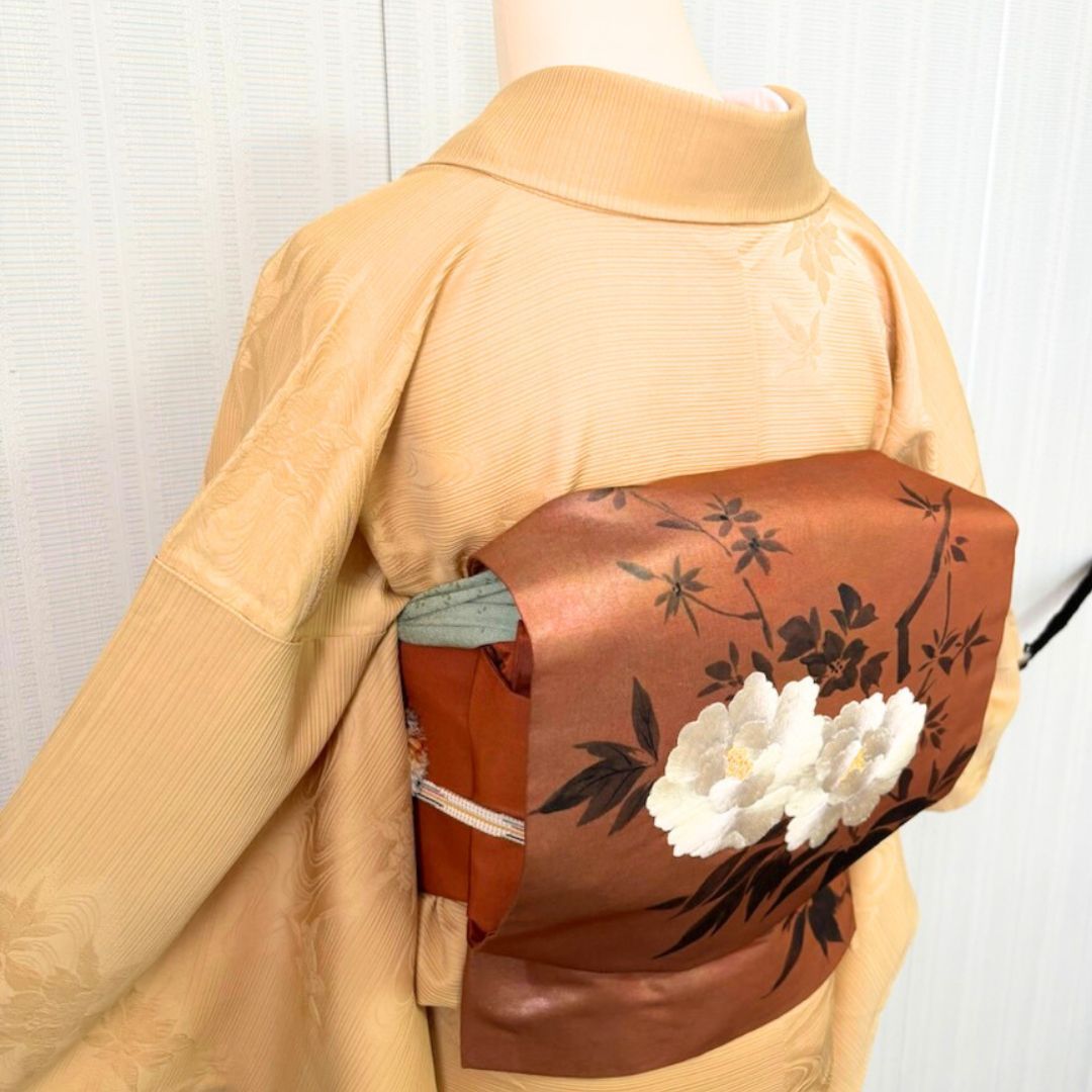 色無地 着物 名古屋帯 帯揚げ 帯締め 4点セット 正絹 ベージュ 無地紋なし 植物地紋 身丈156cm 裄63.5cm 帯354cm 上品 コーディネートセット 秋冬 お茶会 入学式 卒業式 七五三 セミフォーマル カジュアル対応 おしゃれきものの検索結果