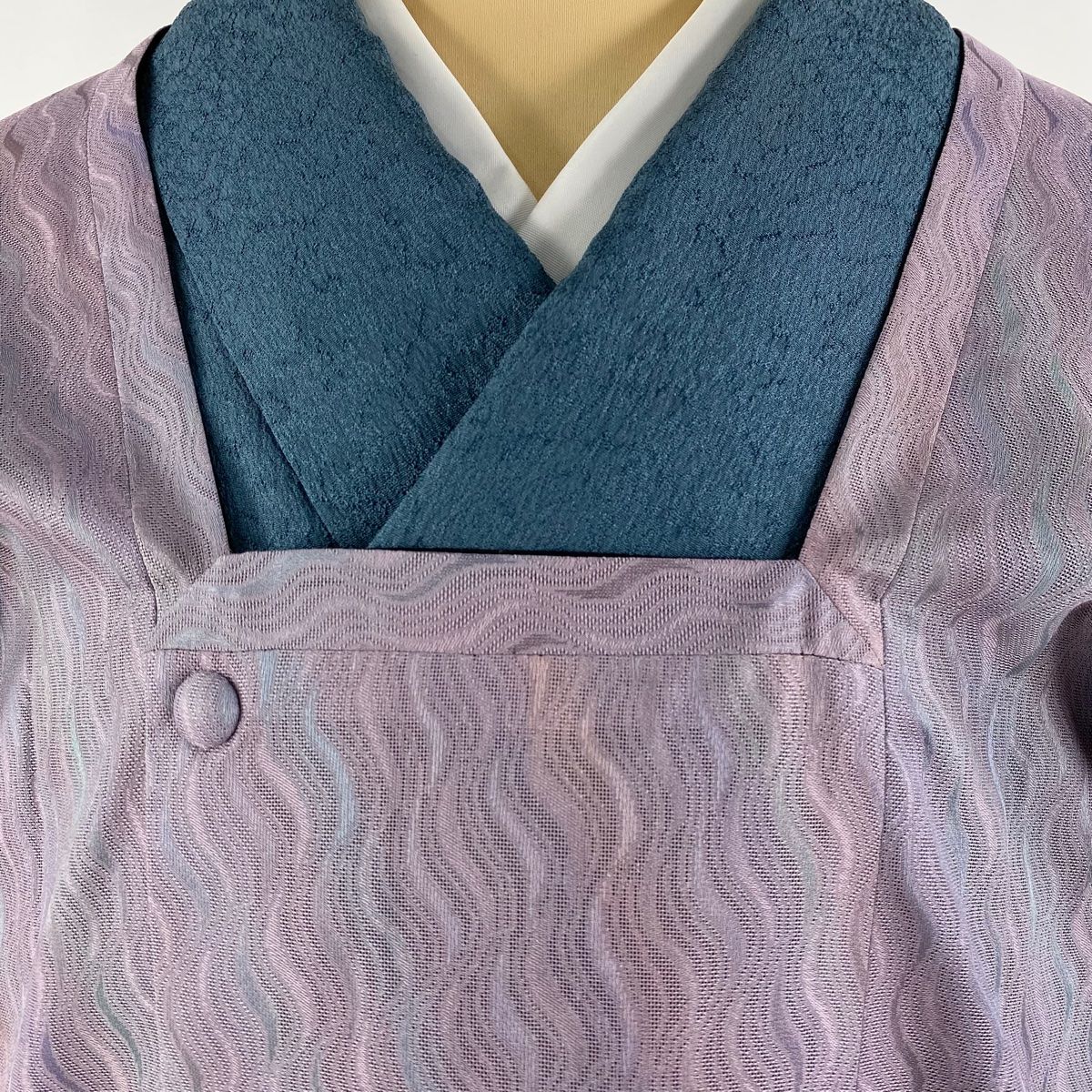 着物衿 コート 単衣 リサイクル 御召 紋紗 お召 正絹 春 夏 秋 西陣 御召機 薄ピンク 薄紫 花七宝 セミフォーマル カジュアル スリーシーズン コート 仕立て上がり 身丈109 裄丈68 Lサイズ 透け感 ハオリモノ みやがわ sb15402