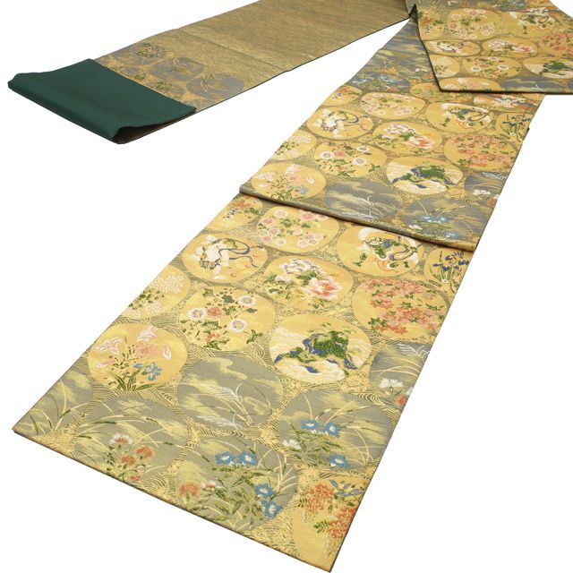 新古品 すごい値 袋帯 フォーマル 正絹 西陣 河瀬満織物 金色 ゴールド 風神 雷神 桜 菊 桔梗 藤 楓 花 仕立て上がり 春秋冬 結婚式 七五三 入学式 卒業式 リサイクル すごいね みやがわ neb01548の検索結果