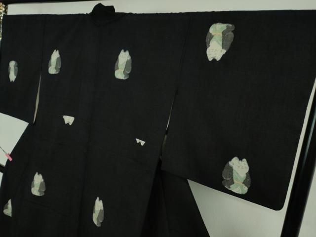 平和屋本店 上 本場結城紬 重要無形文化財 100亀甲 飛び亀甲柄 招き猫 結城屋謹製 黒地 証明証 証紙付き DZAB1341kh5 GLOBALQUALITYIMPORTS_COM