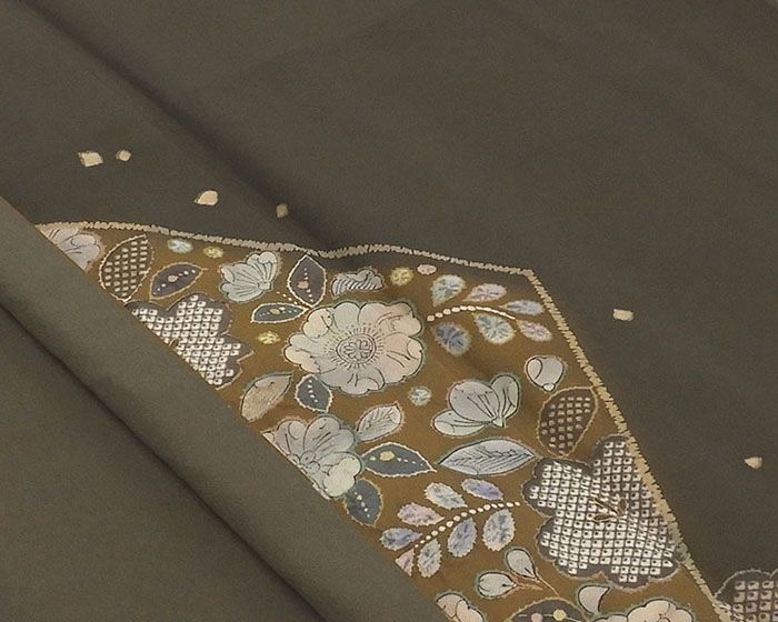 訪問着 身丈159cm 裄丈64cm M 袷 落款 牡丹 草花 金銀彩 金通し 灰緑 正絹 秀品