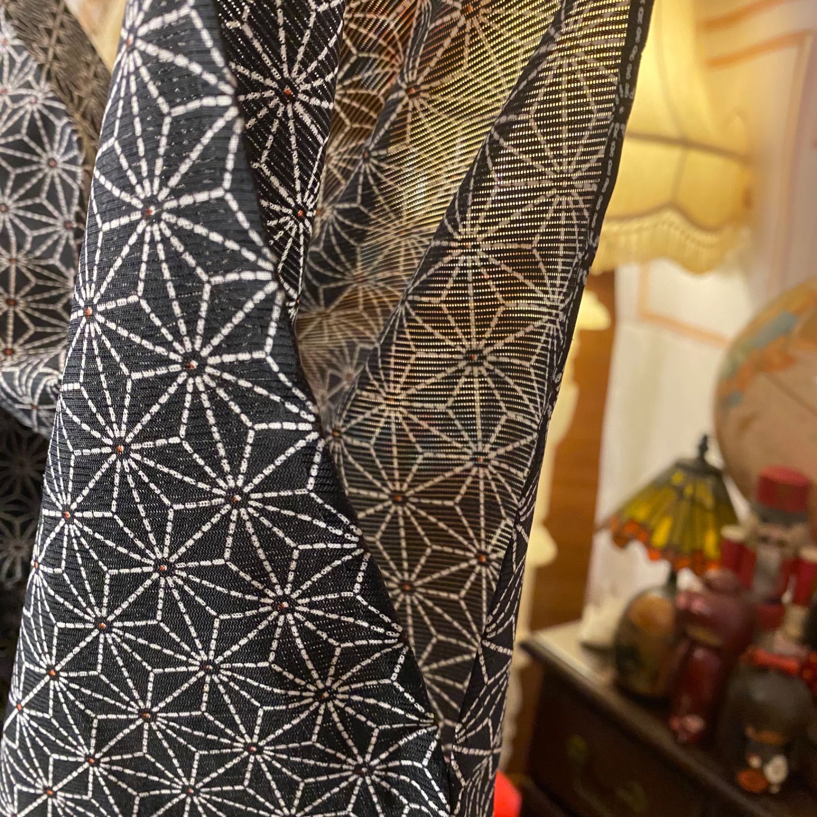 夏着物 2way ガウン 羽織り ドレス ワンピース ハンドメイド 和洋折衷 洗える 化繊 リメイク 帯サッシュベルト レトロ 古着 墨黒 チャコールの地に 生成りの点線で描いた麻の葉 KD-63の検索結果