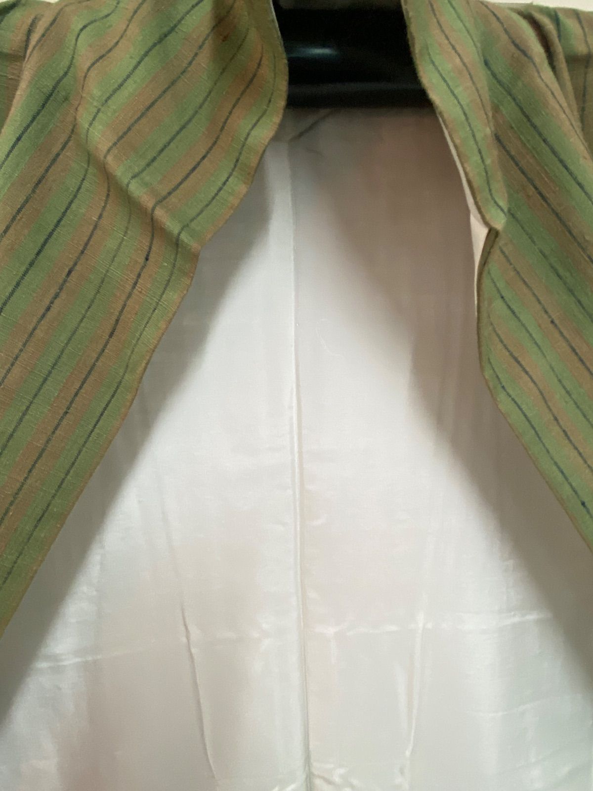 着物 紬 正絹 作家物 太子間道 縦縞模様 袷 緑 オレンジ 着物 和装 OME371の検索結果