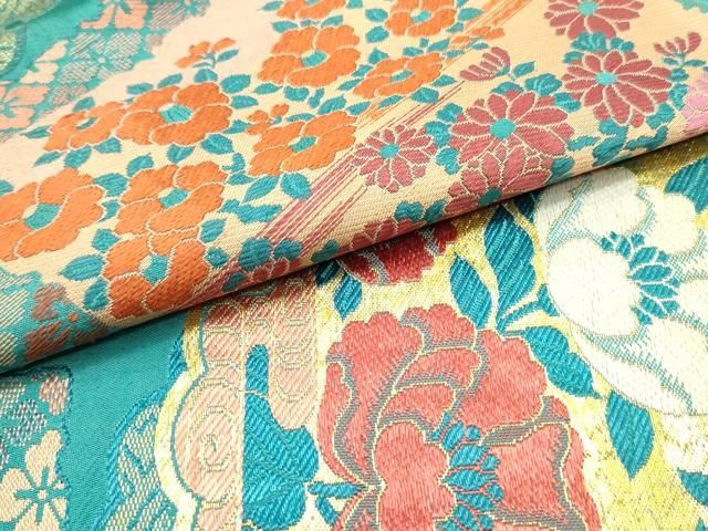 平和屋着物 アンティーク 大正ロマン 九寸名古屋帯 唐織 地紙重ね草花文 金銀糸 正絹 DAAW6853ob