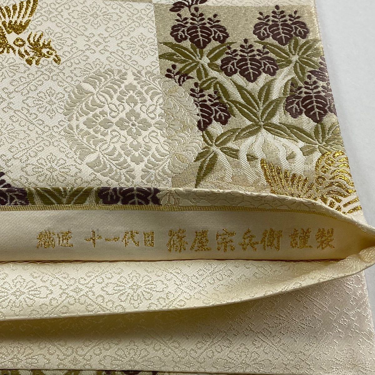 袋帯 落款 篠屋宗兵衛 市松 花鳥 唐織 箔 クリーム 全通 正絹 GLOBALQUALITYIMPORTS_COM