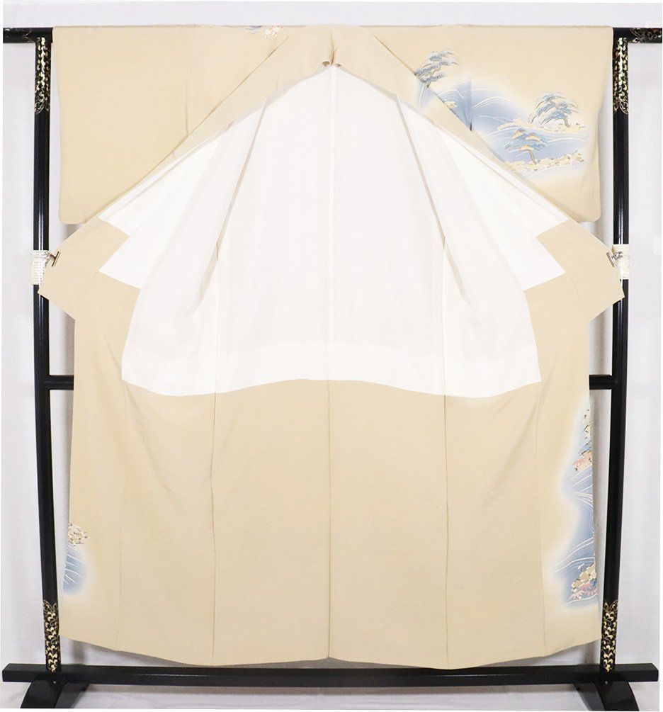 本加賀友禅 吉川久仁氏作 手描き友禅 訪問着 袷 正絹 茶ベージュ 青グレー 茶屋辻 松竹梅 流水 SMサイズ ki28963 ほうもんぎ み GLOBALQUALITYIMPORTS_COM