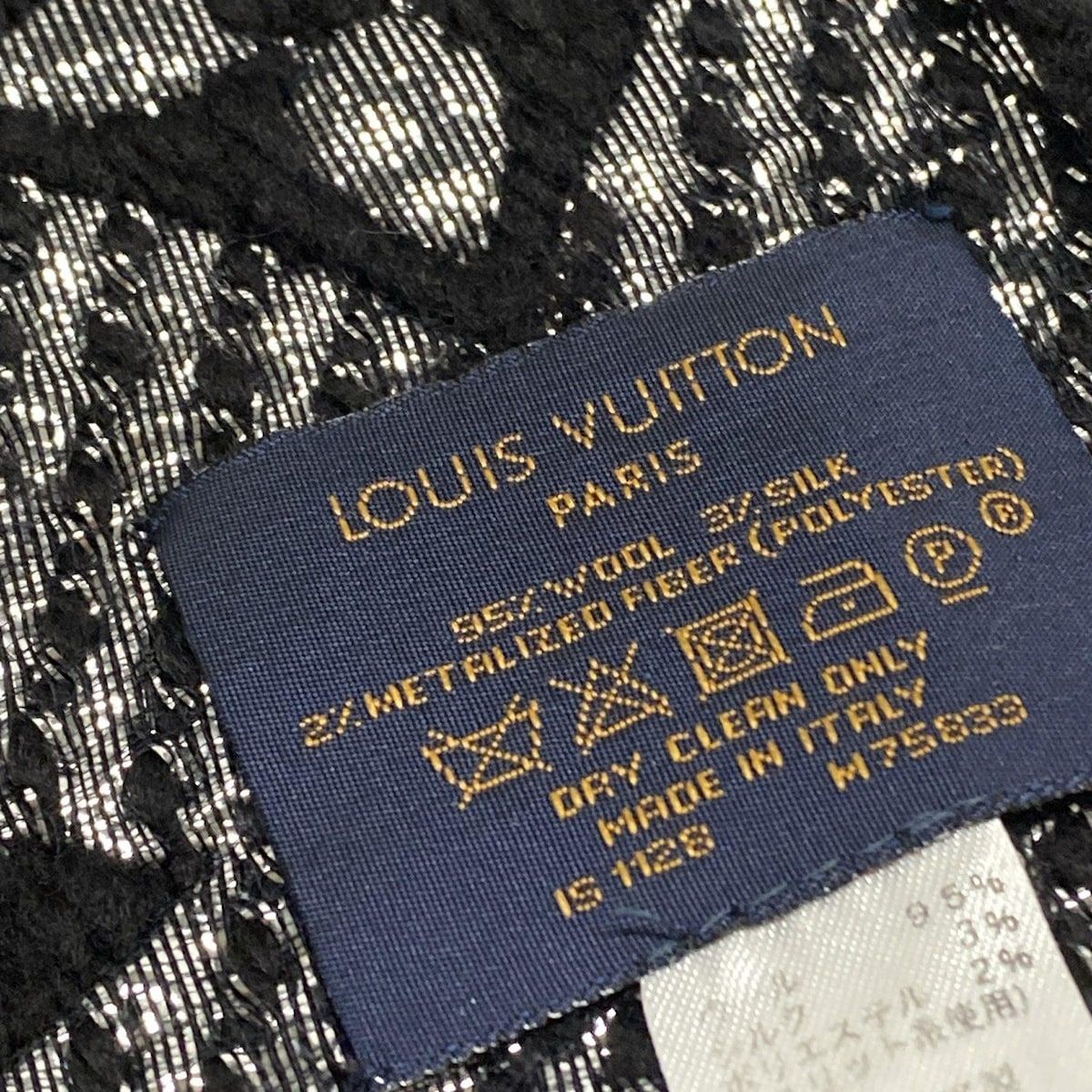 ルイヴィトン マフラー モノグラム エシャルプロゴマニアシャイン M75833 黒×シルバー ラメ フリンジ モノグラム柄 ウール シルク GLOBALQUALITYIMPORTS_COM