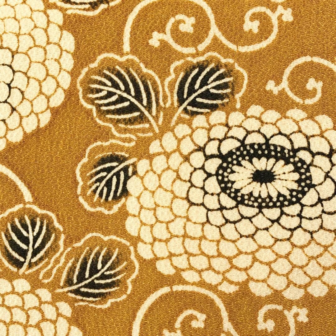 濃卵色のお色味に型染の雰囲気の良い菊の花模様がデザインされた素敵な柄裄のお品でございます。