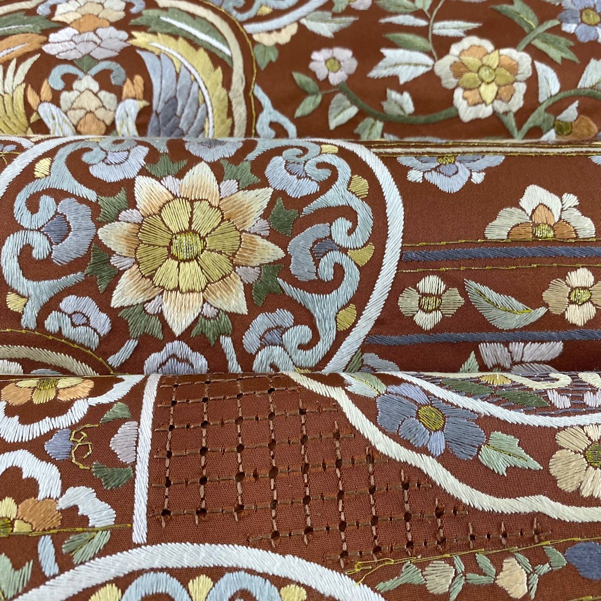 袋帯 華文 向かい鳥 刺繍 金糸 茶色 六通 正絹 GLOBALQUALITYIMPORTS_COM