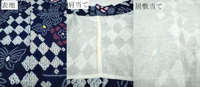 状態は接写画像のように表地にヤケ、肩当て・居敷当てに薄いシミがございますが