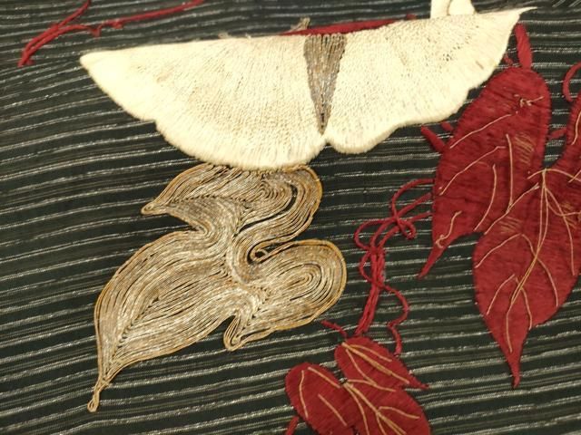 平和屋着物 夏物 アンティーク 大正ロマン 九寸名古屋帯 駒刺繍 総刺繍 蔦の葉花文 朝顔 黒地 銀糸 正絹 DAAY8142cmの検索結果