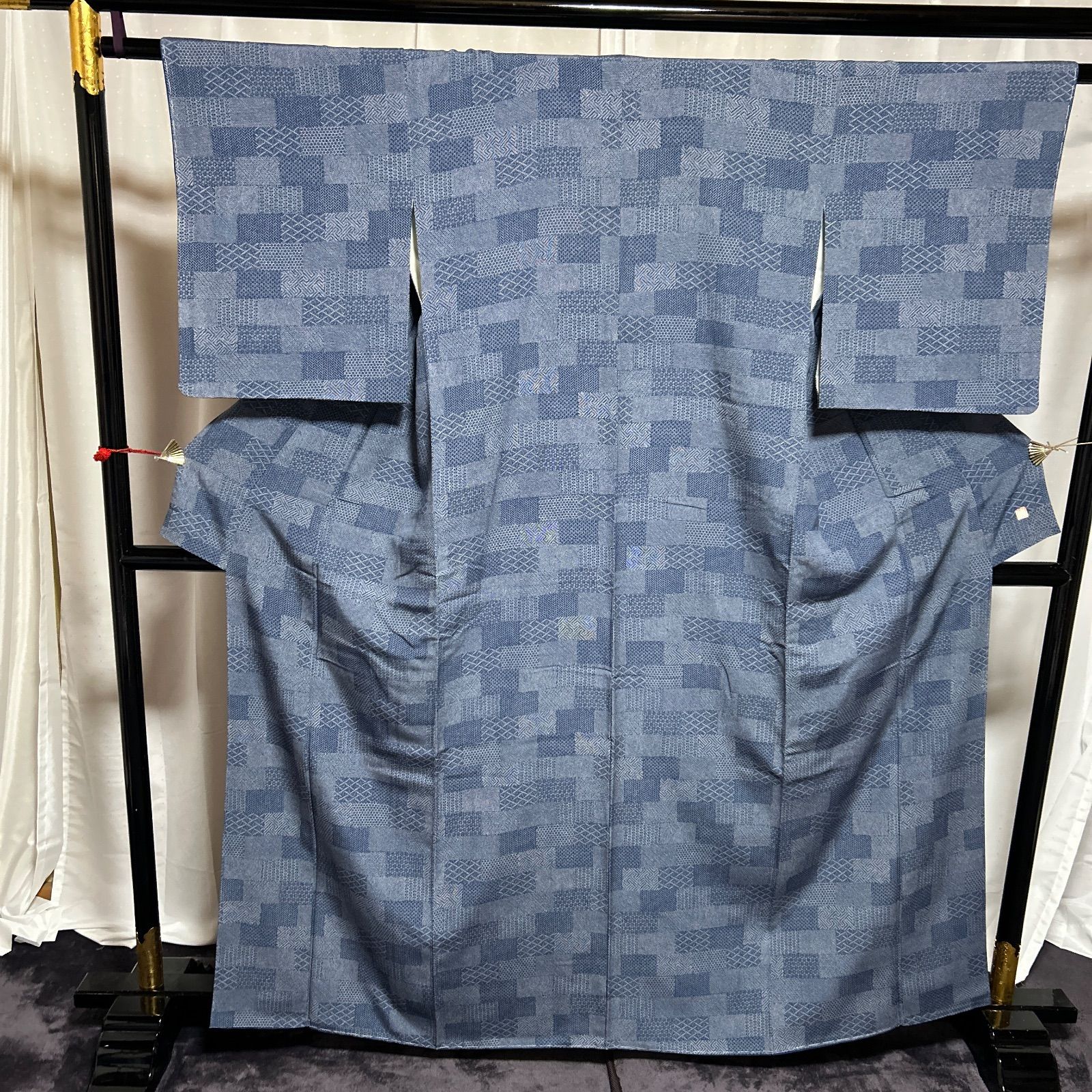 小紋 身丈154cm 裄丈66cm M 袷 幾何学模様 紺色 正絹
