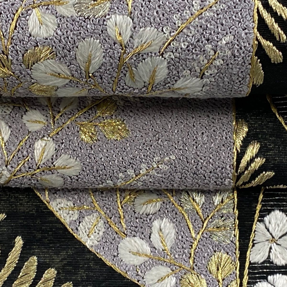 袋帯 草花 波 刺繍 金銀糸 黒 お太鼓柄 正絹の検索結果