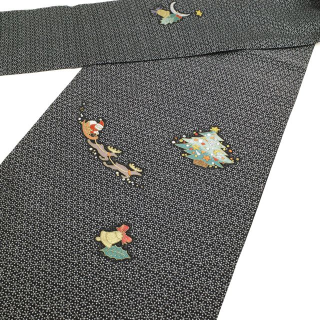 【新品】 名古屋帯 リサイクル 九寸 正絹 黒地 ブラック メリークリスマス サンタクロース クリスマスツリー ベル 柊 雪の結晶 金銀糸 かわいい お洒落 お太鼓柄 カジュアル 冬 美品 仕立て上がり みやがわ sb54600