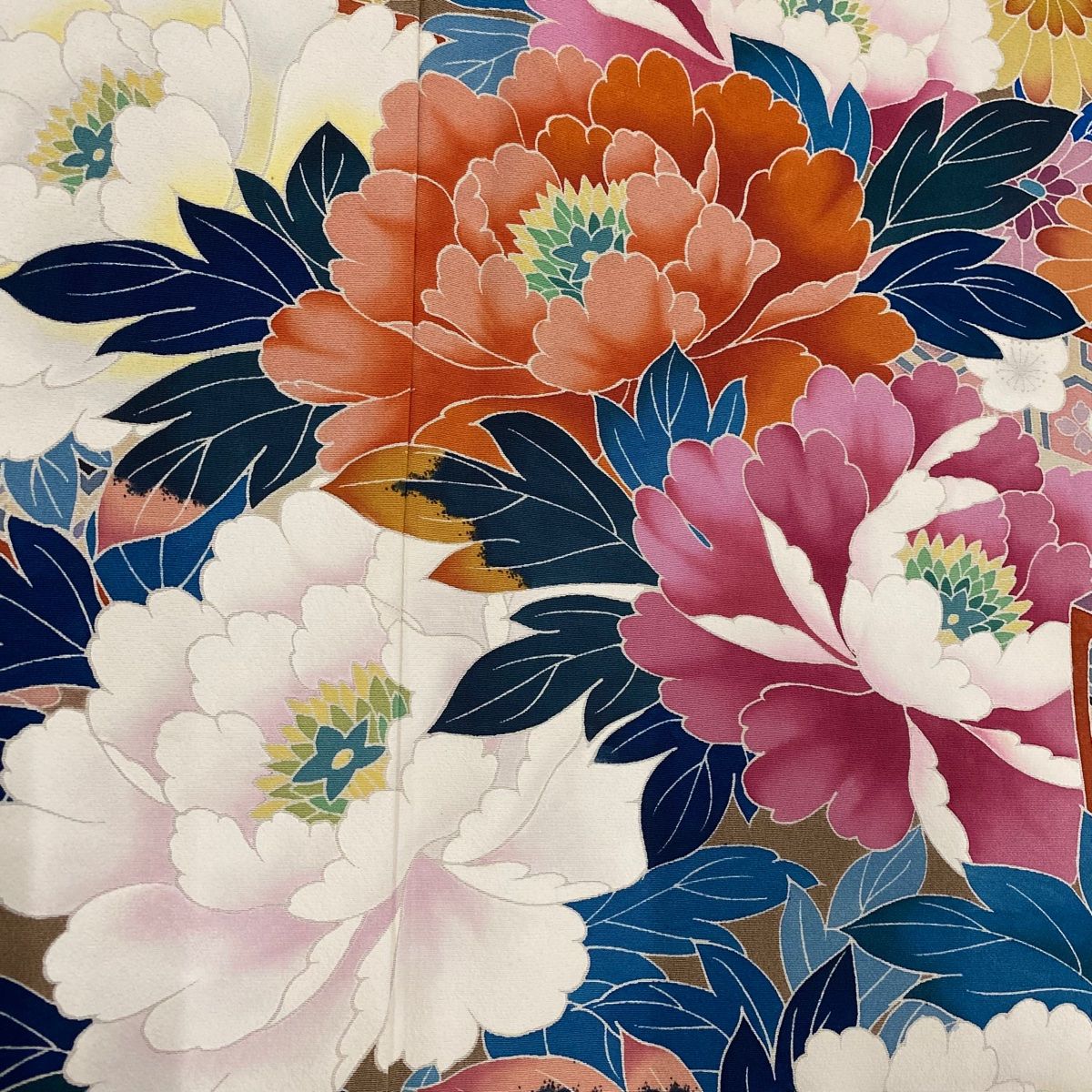 振袖 身丈161cm 裄丈64cm M 袷 落款 牡丹 菊 茶色 正絹の検索結果