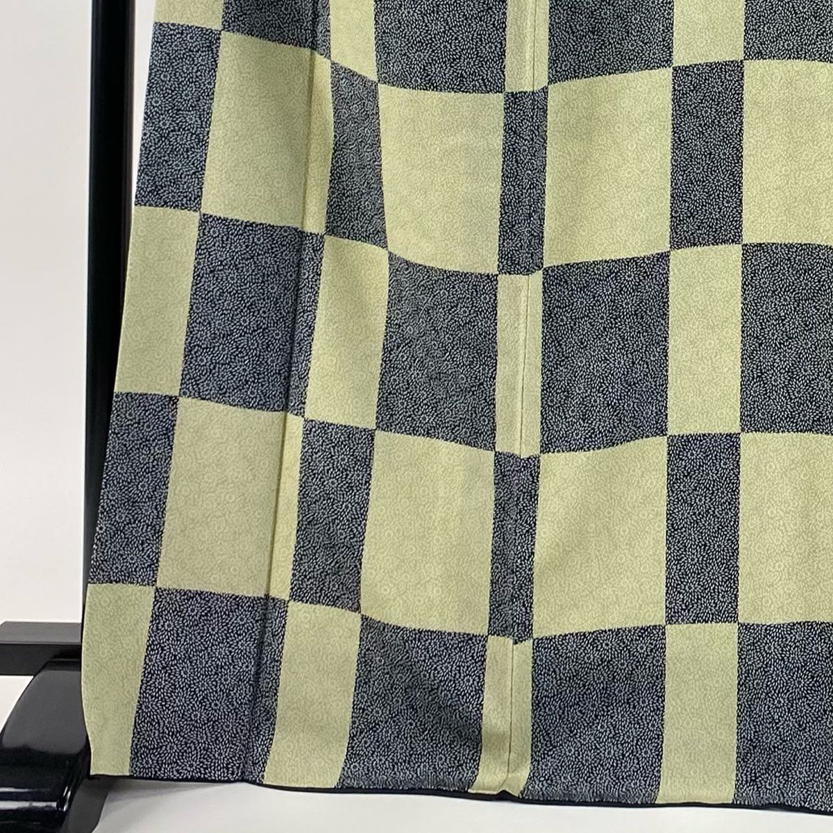 小紋 身丈169cm 裄丈69cm L 袷 鈴乃屋 菊 市松 ちりめん 抹茶色 正絹 秀品 GLOBALQUALITYIMPORTS_COM