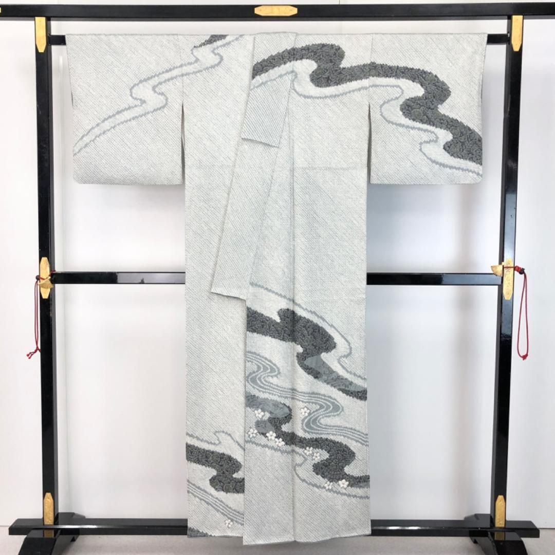 付下げ 袷 レディース 正絹 黒 グレー 露芝文 身丈163cm 裄丈67cm パーティ M~Lサイズ相当