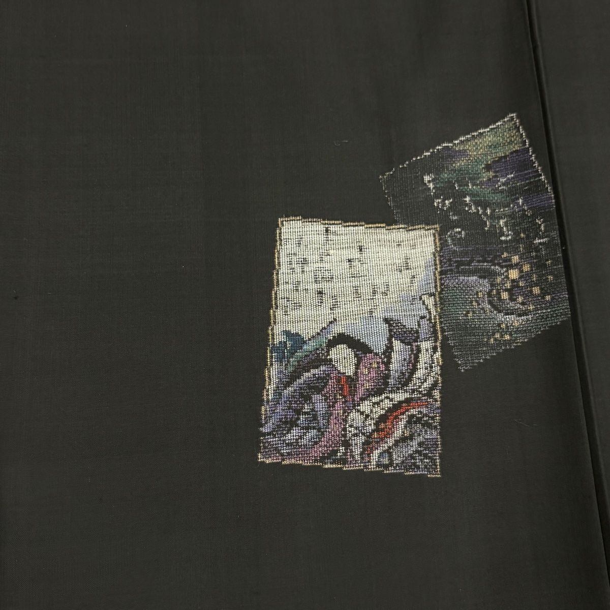 紬 身丈155.5cm 裄丈64.5cm M 袷 かるた 人物 墨色 正絹の検索結果
