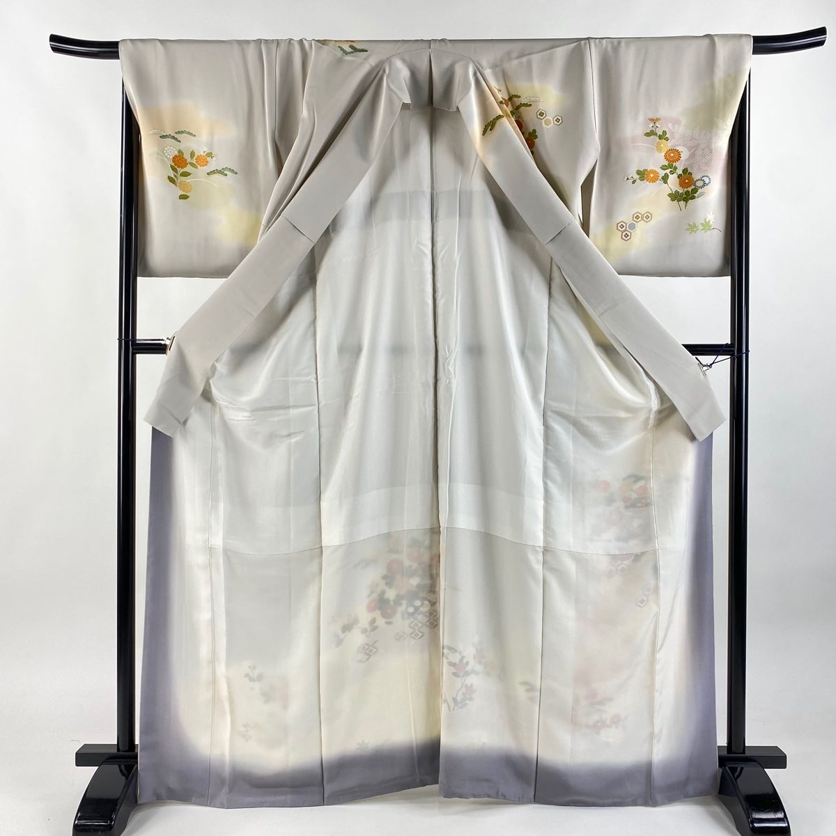 訪問着 身丈164.5cm 裄丈65.5cm M 袷 御所車 草花 金彩 灰色 正絹 秀品