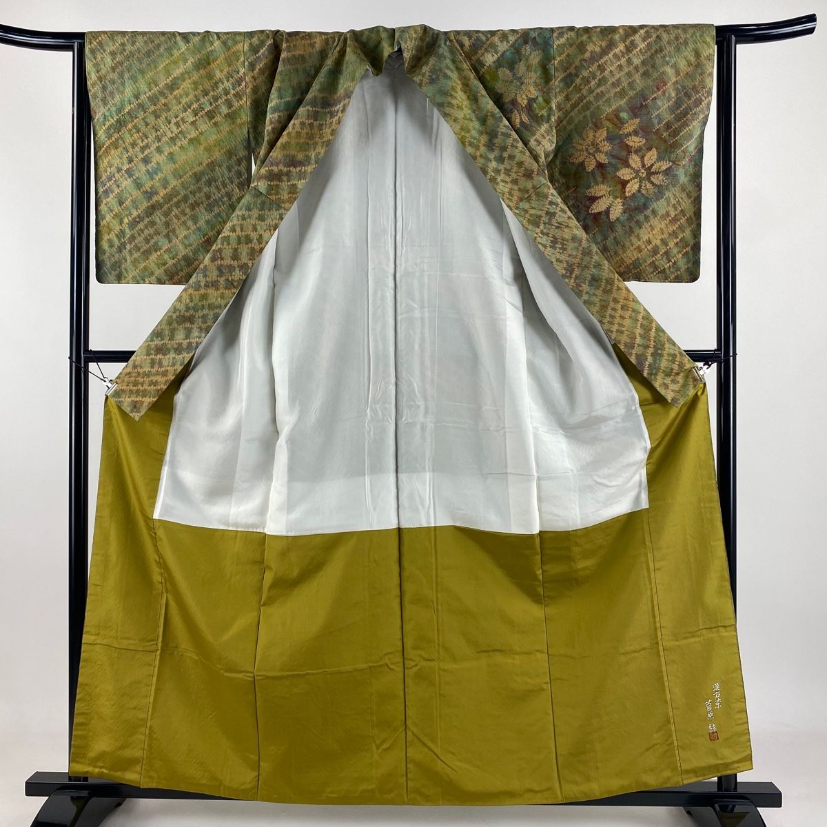 付下げ 身丈159.5cm 裄丈64.5cm M 袷 菅原結 紬地 やまと 落款 花 斜縞 絞り 漢方染 茶緑色 正絹 GLOBALQUALITYIMPORTS_COM
