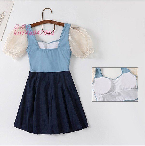 ワンピース水着 レディース プリンセス風 かわいい パフスリーブ リボン 水着 着〓せ 撮影 温泉 プール ビーチ ブルー S M L 2L T2M3