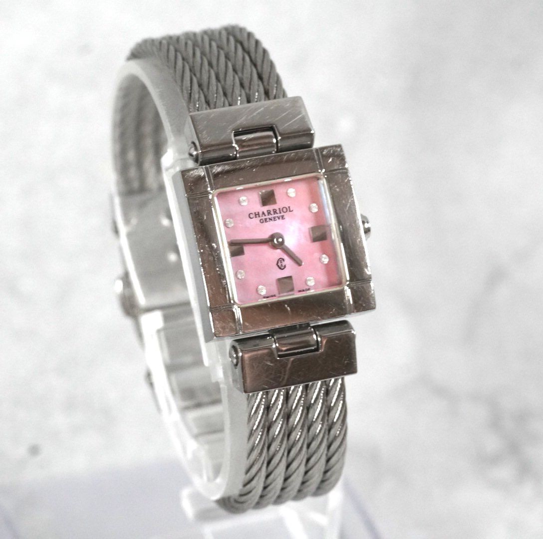 電池交換済 シャリオール CHARRIOL コロンブス ピンクシェル 8Pダイヤ クォーツ レディース ウォッチ ladies wacth ワイヤー ケーブル スクエア GENÈVE 稼働品 GLOBALQUALITYIMPORTS_COM