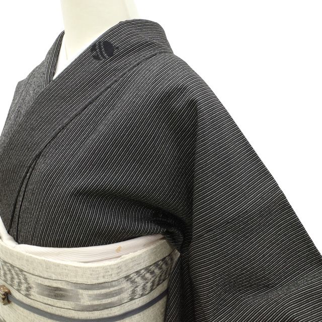 新古品 塩沢 袷 着物 正絹 塩澤 黒 ブラック 縞 鈴 かわいい モダン お洒落 モノトーン カジュアル 春 秋 冬 塩澤 仕立て上がり 身丈168 裄68 Lサイズ みやがわ sb16468の検索結果