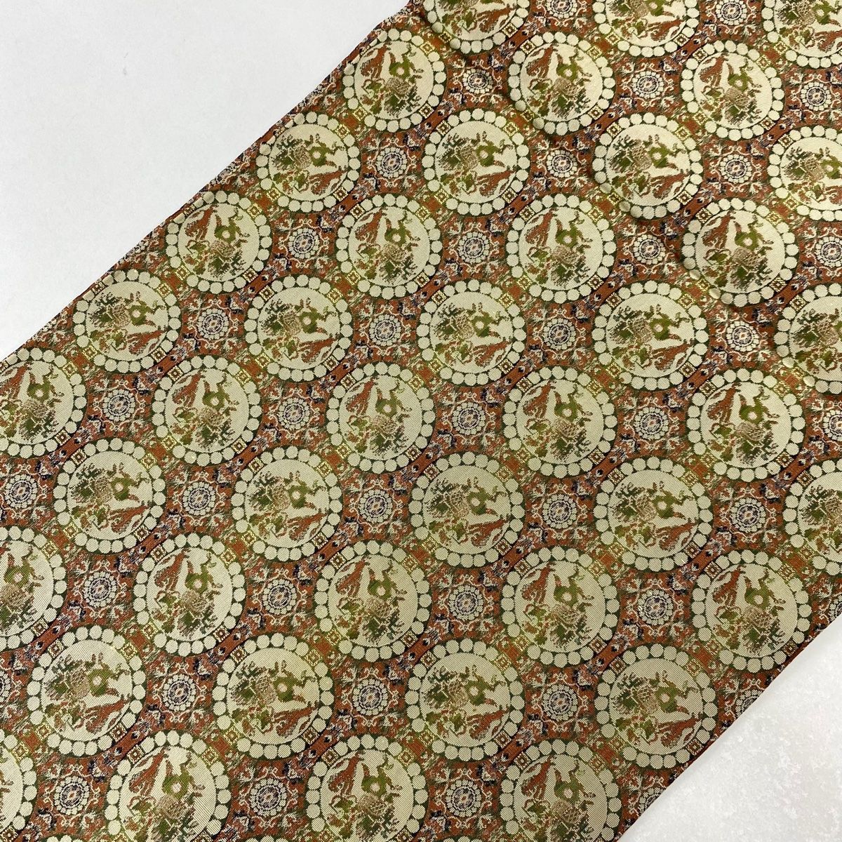 開き名古屋帯 龍村美術織物 比翼仕立て 獅子狩文錦 赤茶 正絹 GLOBALQUALITYIMPORTS_COM