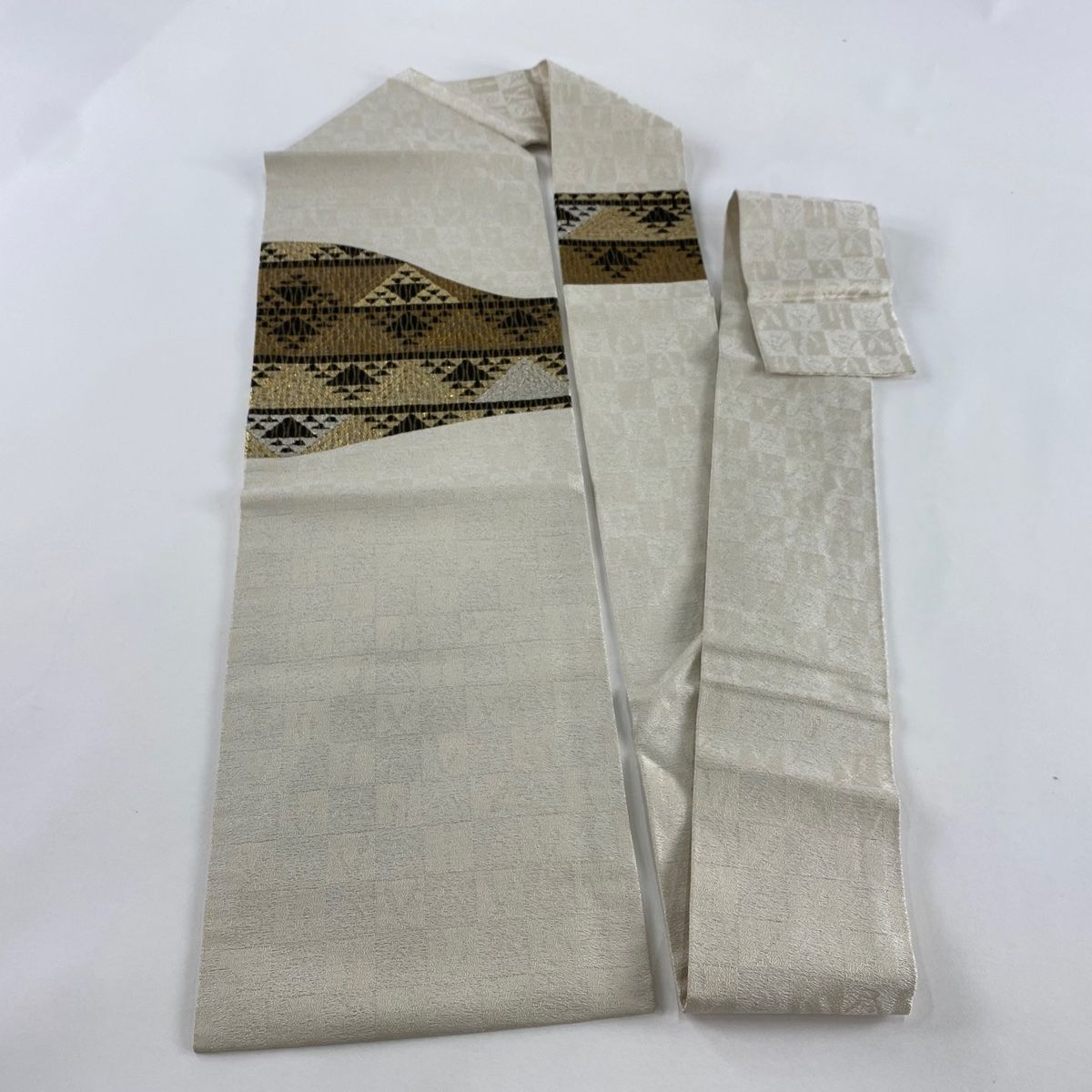 名古屋帯 鱗 縞 金糸 箔 ベージュ 正絹 GLOBALQUALITYIMPORTS_COM
